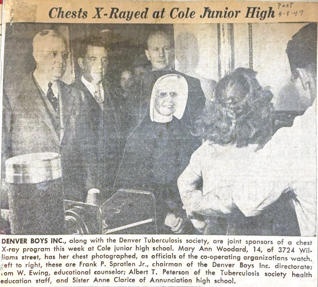 Denver Boys also responded to the needs of the times during the tuberculosis crisis. Tuberculosis rates rose during the Great Depression as widespread malnutrition weakened immune systems. In response, Denver Boys expanded its role in the community by offering free chest X-rays to children and families throughout Denver to enable early detection and slow transmission, ultimately serving over 6,000 Colorado residents.